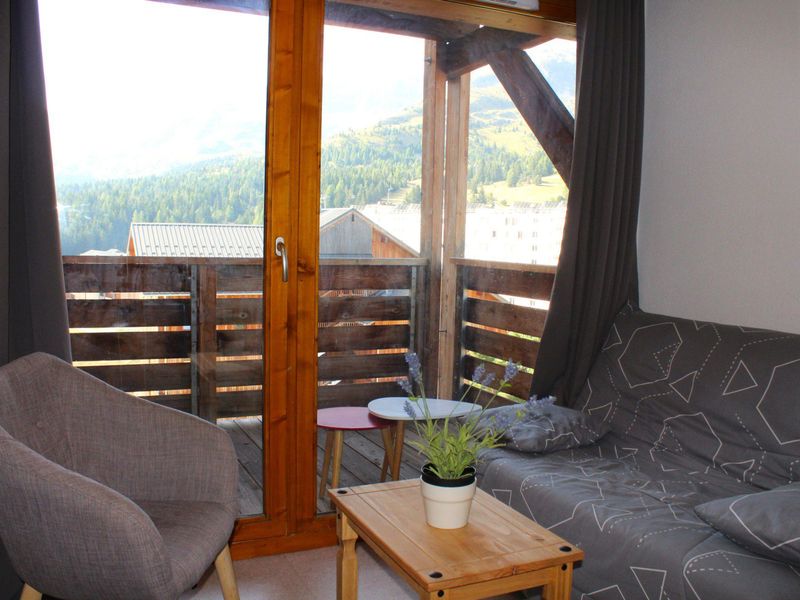Balkon op het zuiden, prachtig uitzicht op het skigebied en de Pic de Bure. Appartement aan de voet van de pistes.