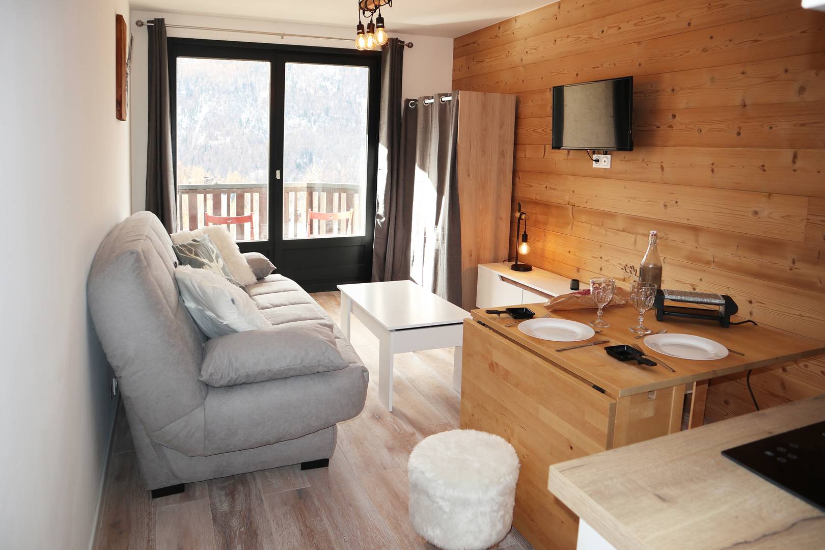 In een residentie gelegen op het centrale plein, zeer mooi gerenoveerd studio, uitgerust voor 2 personen, gelegen in het hart van het station met directe toegang tot de pistes en de winkels, 5e verdieping met lift, bestaande uit een woonkamer met 1 2-persoons slaapbank, een open keuken in de woonkamer, een badkamer met WC. Laminaatvloer in de gehele accommodatie. Groot balkon op het zuiden met uitzicht op de vallei en de ijsbaan.